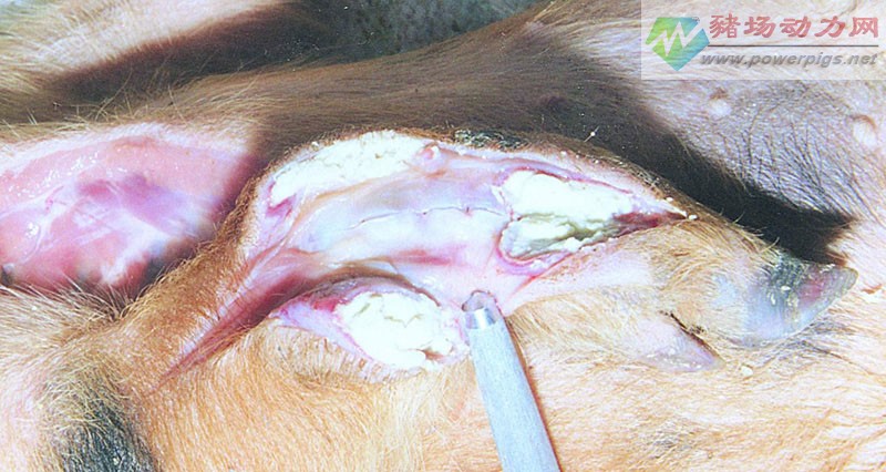 附图六、关节炎型临床症状:左前肢关节肿胀,切开可见干固脓灶